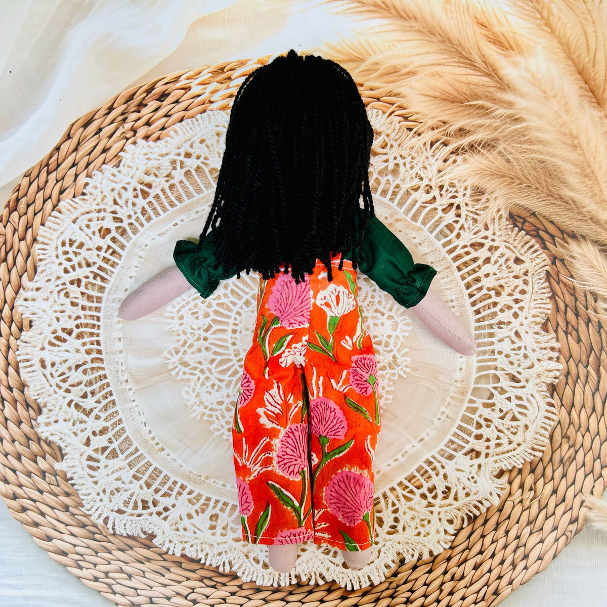 More than just a toy — she’s a story, a statement, and a spark of inspiration. Dressed in a stylish upcycled fabric jumpsuit, this handcrafted doll represents today’s confident, curious, and bold young girl. Every stitch tells a story of empowerment, tradition, and sustainability.