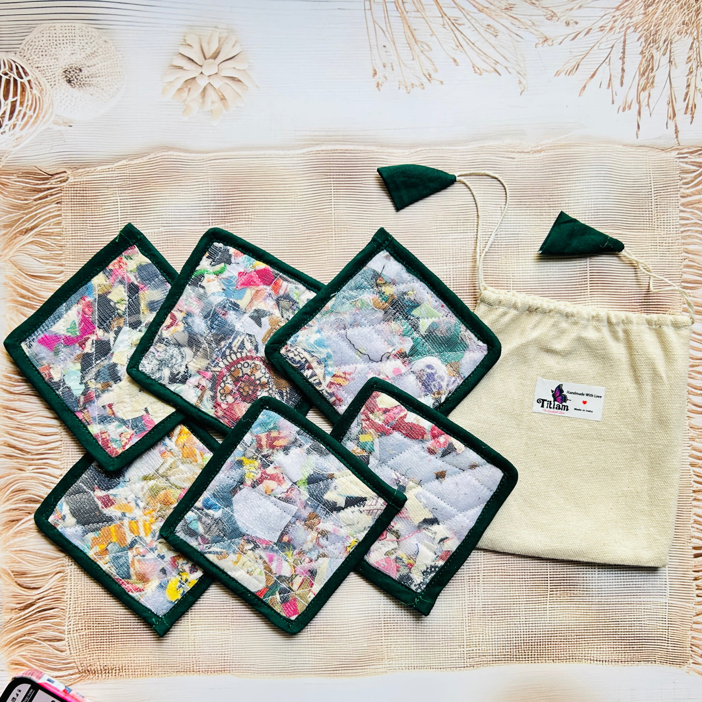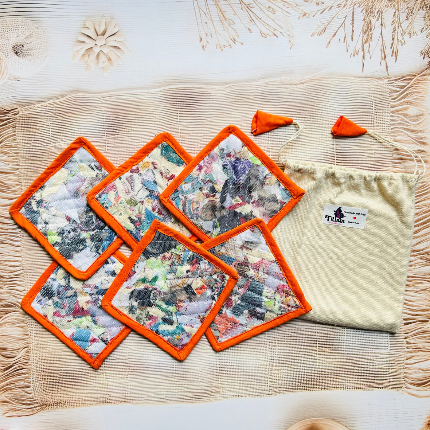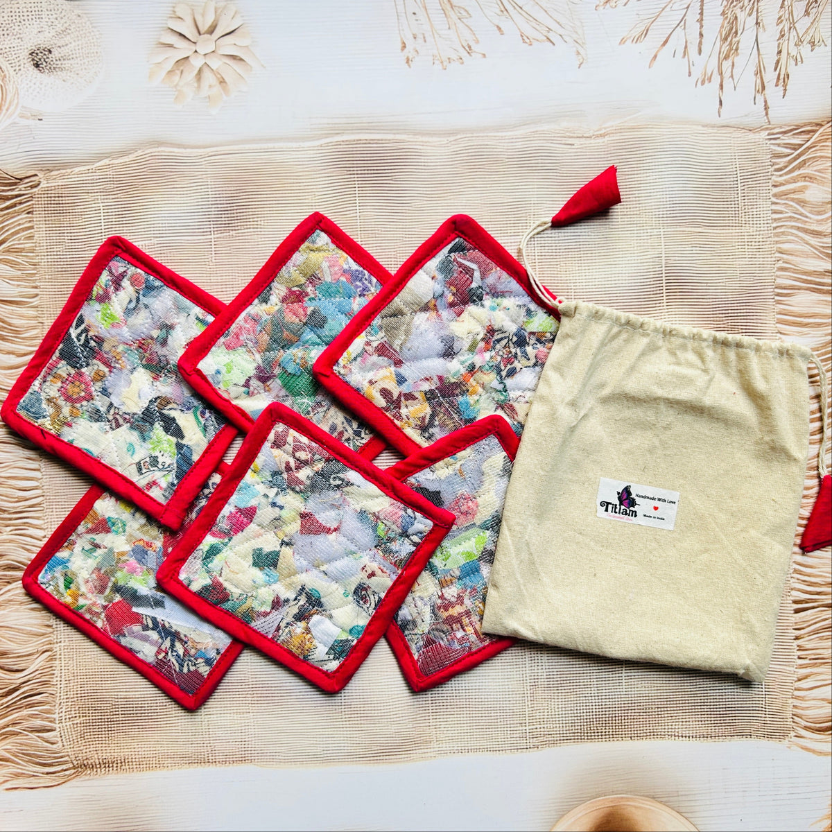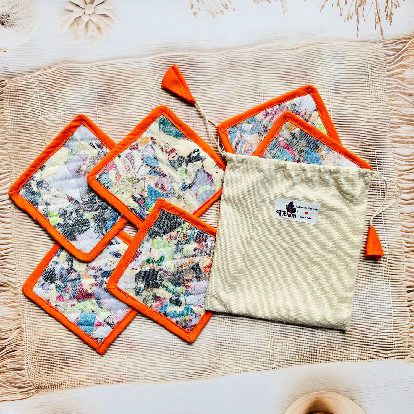 Add a touch of conscious living to your table with our eco-friendly Repurposed Fabric Coasters, thoughtfully handcrafted using post-production textile waste by rural women artisans. Every piece is unique, just like the story behind it.