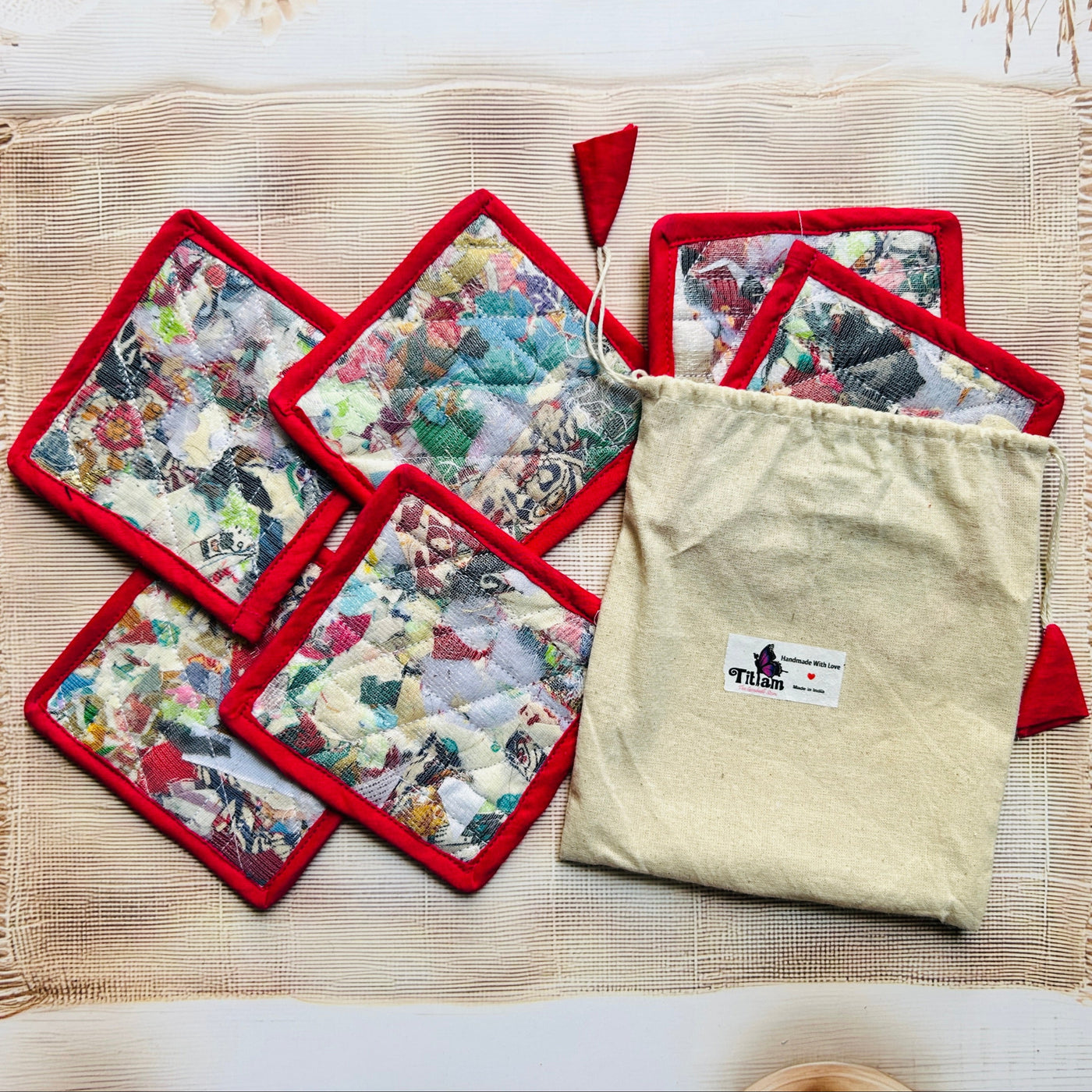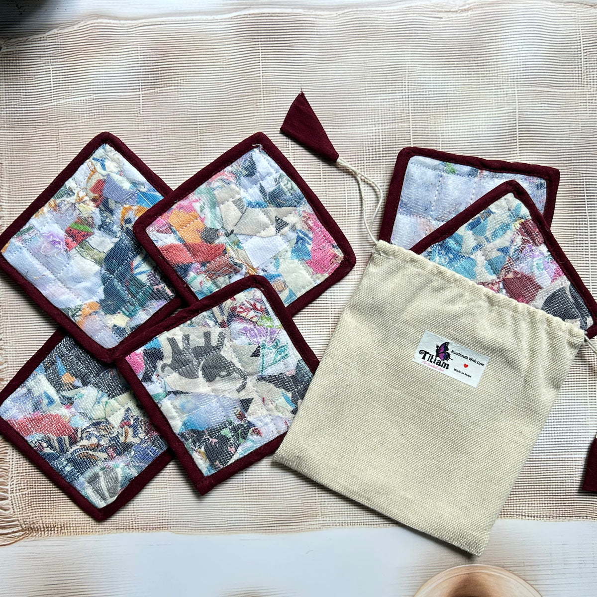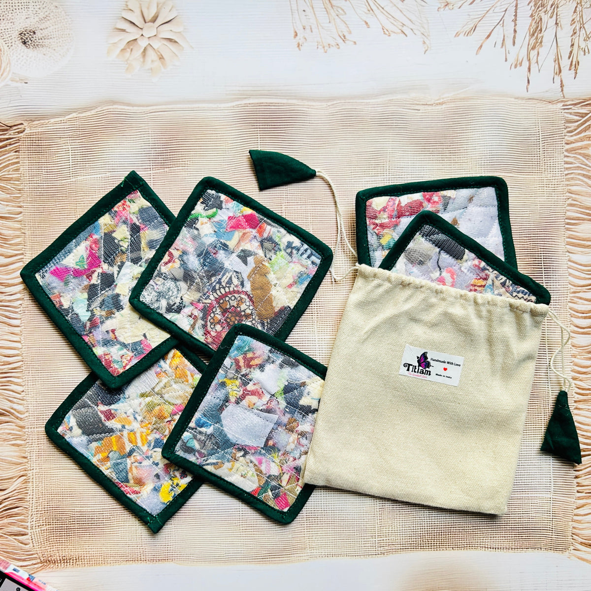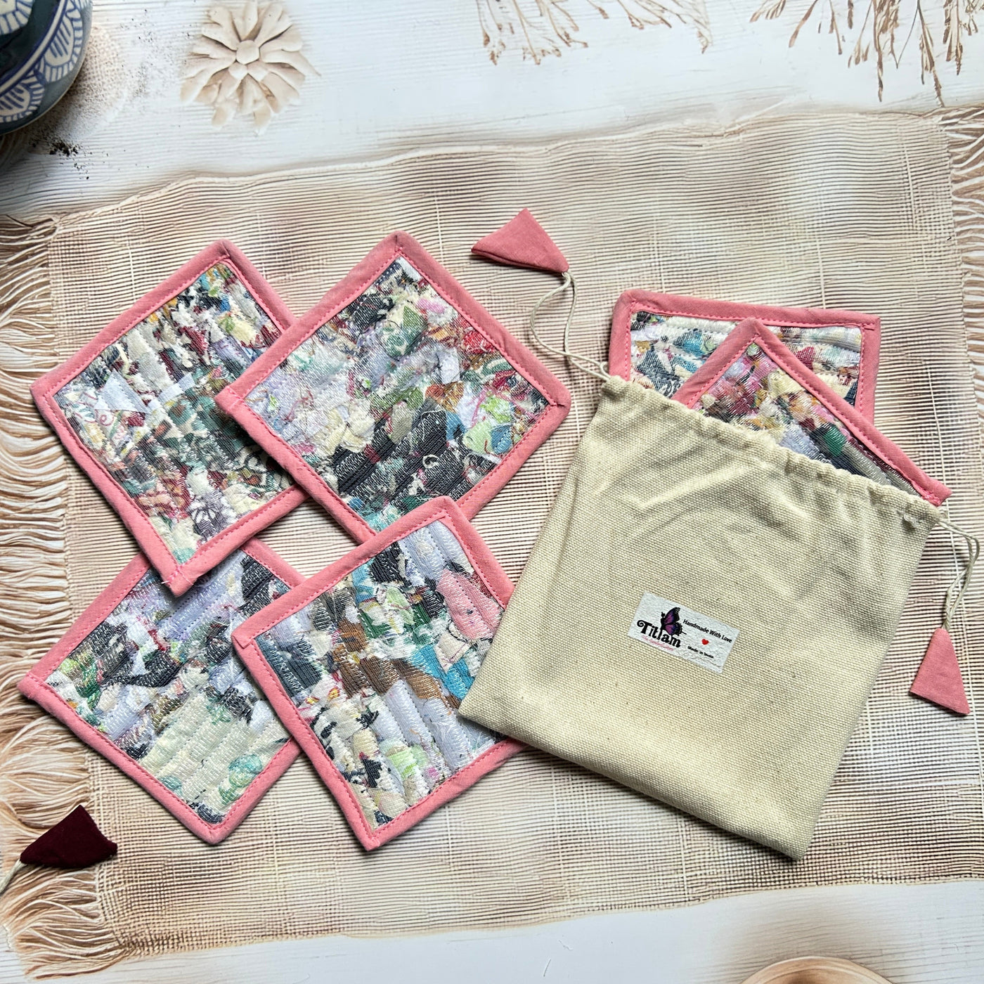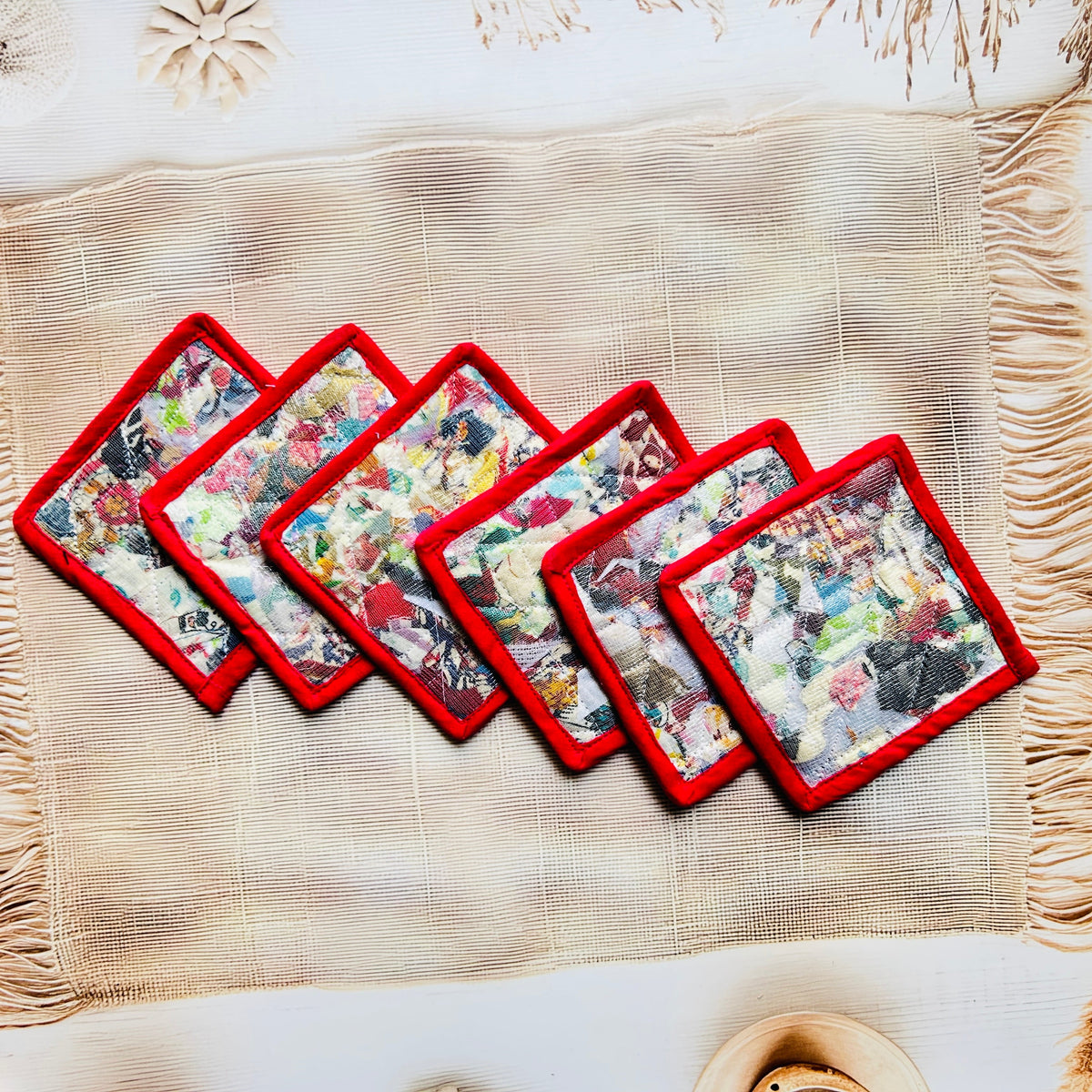 Add a touch of conscious living to your table with our eco-friendly Repurposed Fabric Coasters, thoughtfully handcrafted using post-production textile waste by rural women artisans. Every piece is unique, just like the story behind it.